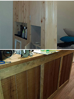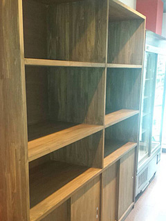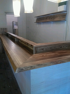 新規オープンに際し、カウンター塗装をご依頼いただきました。今回は上記のケースと異なり、つや消しを施し落ち着いた雰囲気に仕上げました。壁面棚も同様の加工をし、店内に統一感を持たせました。