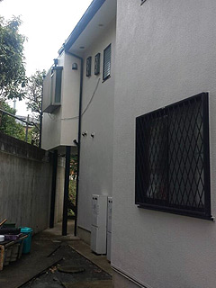 水漏れしているとのご相談を受け、現地調査をしたところ壁のひび割れによるものと判明。まずひび割れをコーキング工事し、その上に明るい色味での外壁塗装を施しました。コーキング部分が目立たぬよう丁寧に仕上げました。