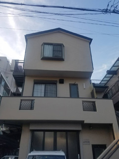 経年劣化に伴い、外壁の塗装をご依頼いただきました。屋根や窓枠の黒色が映えるよう、モダンな雰囲気を重視し明るいベージュでの塗り替えをご提案させていただきました。